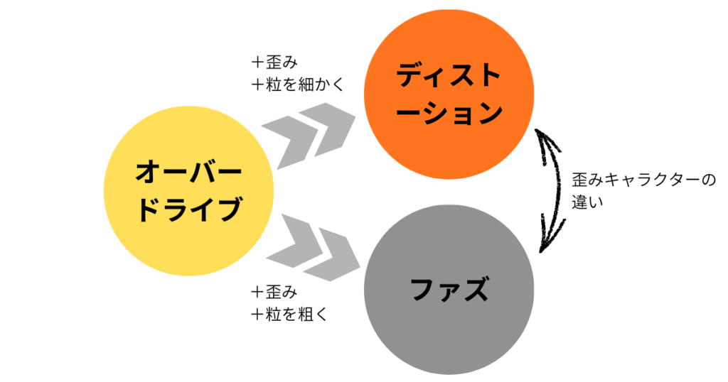 図を見てわかる通り、歪みの強さはオーバードライブ < ディストーション、オーバードライブ < ファズです。