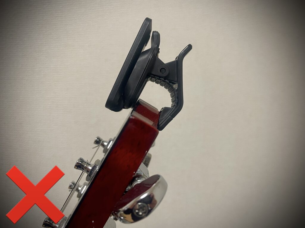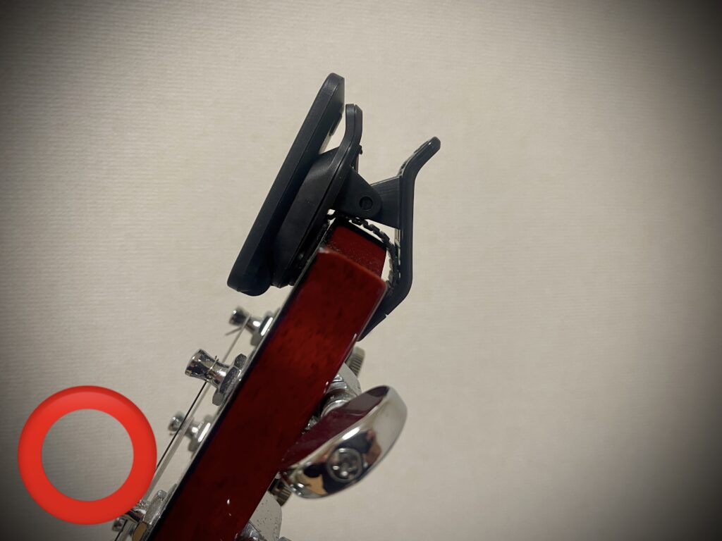 下の写真の通り、クリップチューナーの設置面が少ない場合、振動を拾いきれず、メーターが反応しない場合があります。
